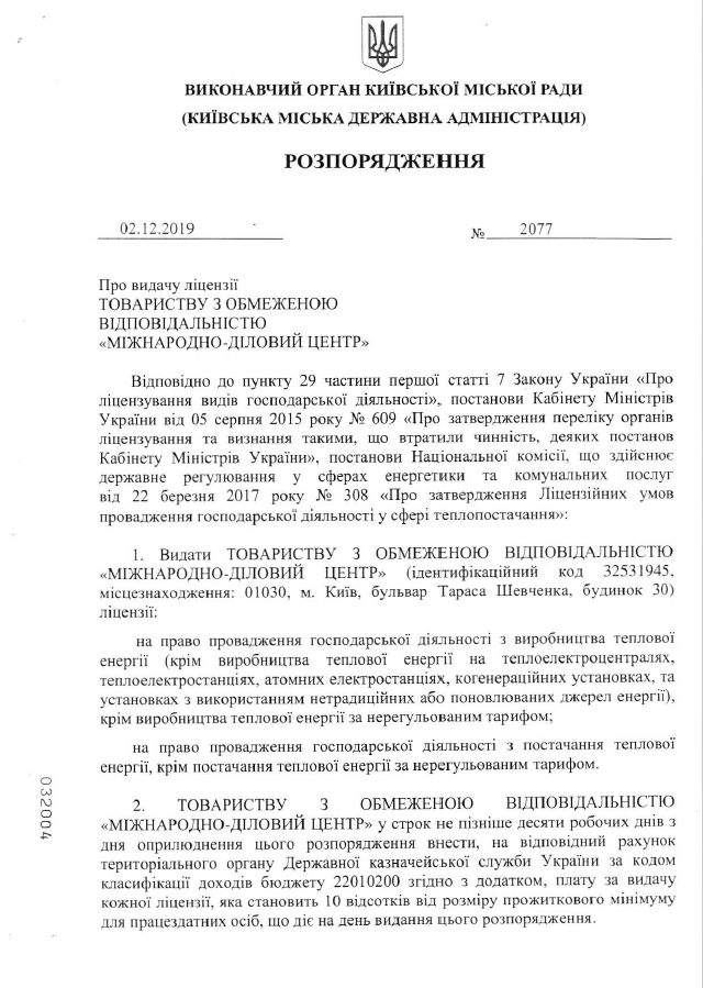 Повідомляємо, що Товариство з обмеженою відповідальністю «Міжнародно-діловий центр» отримало ліцензію на право провадження господарської діяльності з виробництва та постачання теплової енергії .