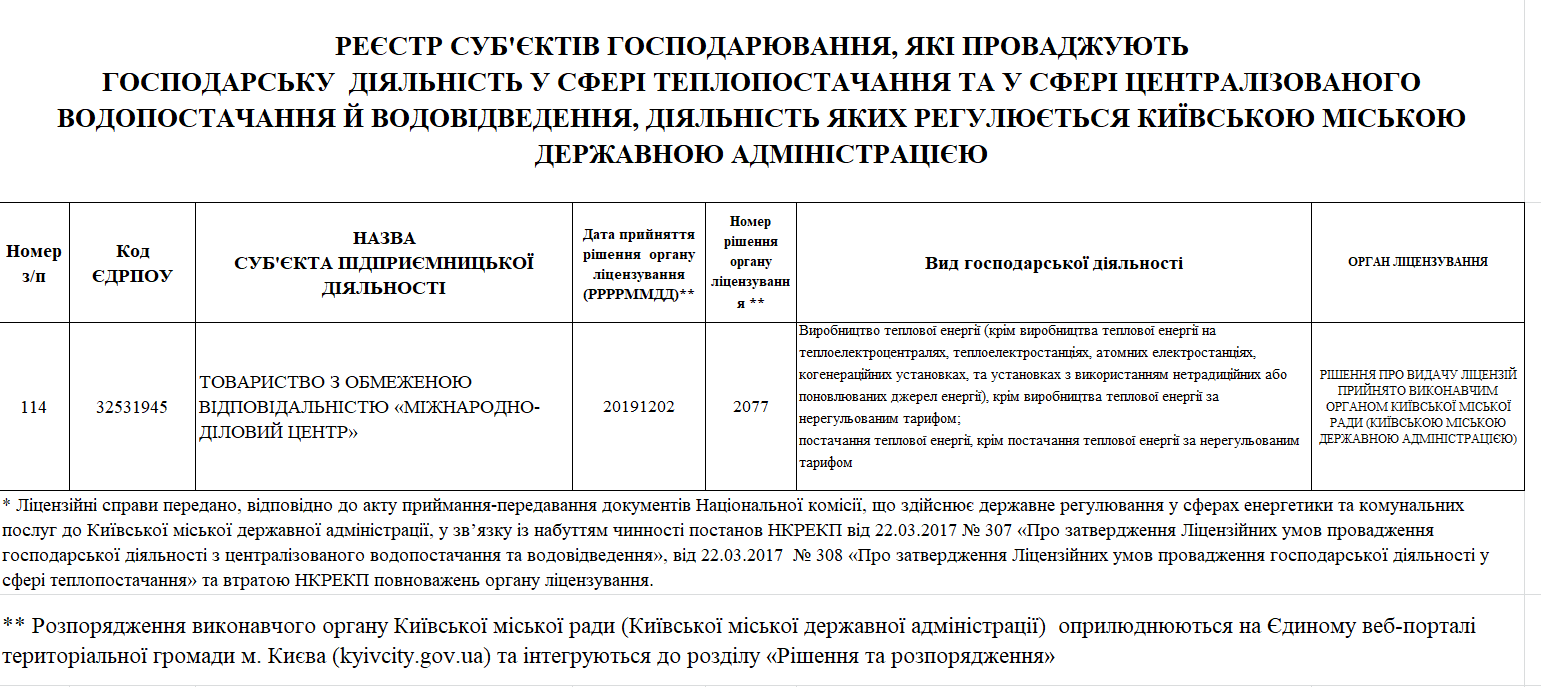 Повідомляємо, що Товариство з обмеженою відповідальністю «Міжнародно-діловий центр» отримало ліцензію на право провадження господарської діяльності з виробництва та постачання теплової енергії .